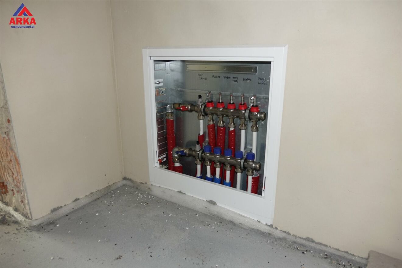 W całym budynku rozprowadzone jest ogrzewanie podłogowe oraz instalacja elektryczna i wodno-kanalizacyjna. Dom wyposażony dodatkowo w instalację centralnego odkurzania oraz instalację alarmową.