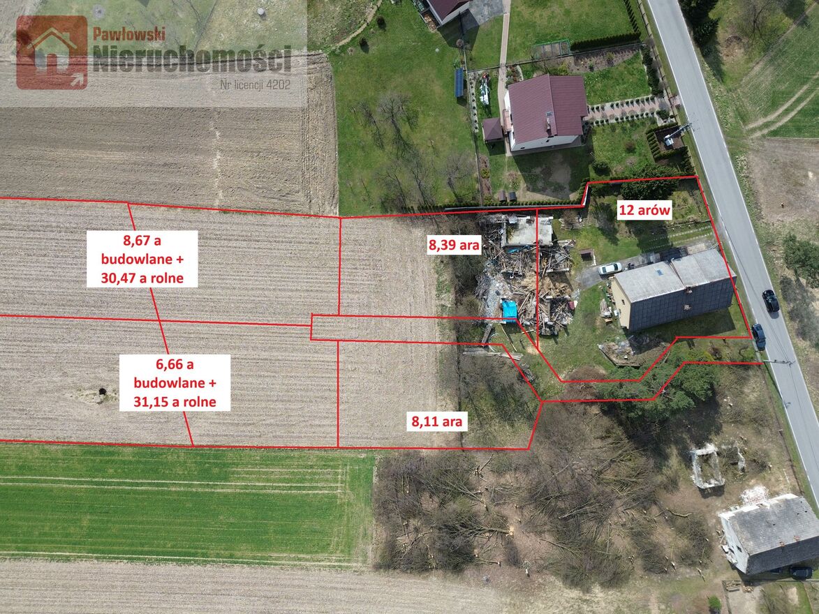 Dostępna jest również działka o powierzchni 8,67 ara budowlanego oraz 30,47 ara rolnego w cenie 159 000 zł.